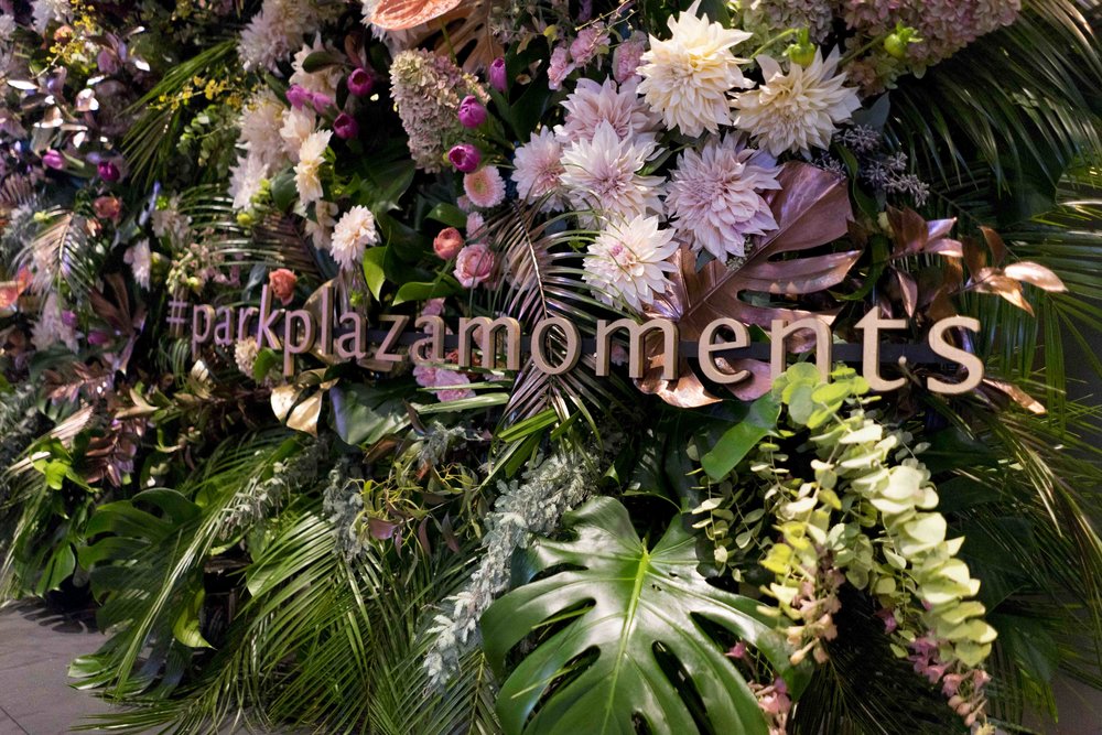 We hebben ook de naam van het hotel en de hashtag van de avond '#parkplazamoments' met een laser uit hout gesneden en in metallic goud geverfd om bij het thema te passen, wat vervolgens werd verwerkt als onderdeel van de uiteindelijke muur. Er werden ook staande bloemstukken gemaakt om de grote receptie van het hotel te versieren. Trapleuningen werden gedetailleerd met slingers van alle bloemversieringen, om de VIP-gastenlijst te verwelkomen, inclusief actrice Victoria Koblenko, wat perfect bij de belettering paste!